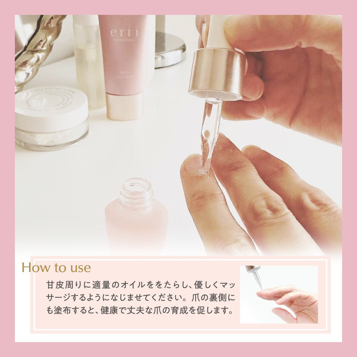 ハンドケアの最高峰を目指したハンドケアアイテム《erii》のプレミアムネイルオイルです。